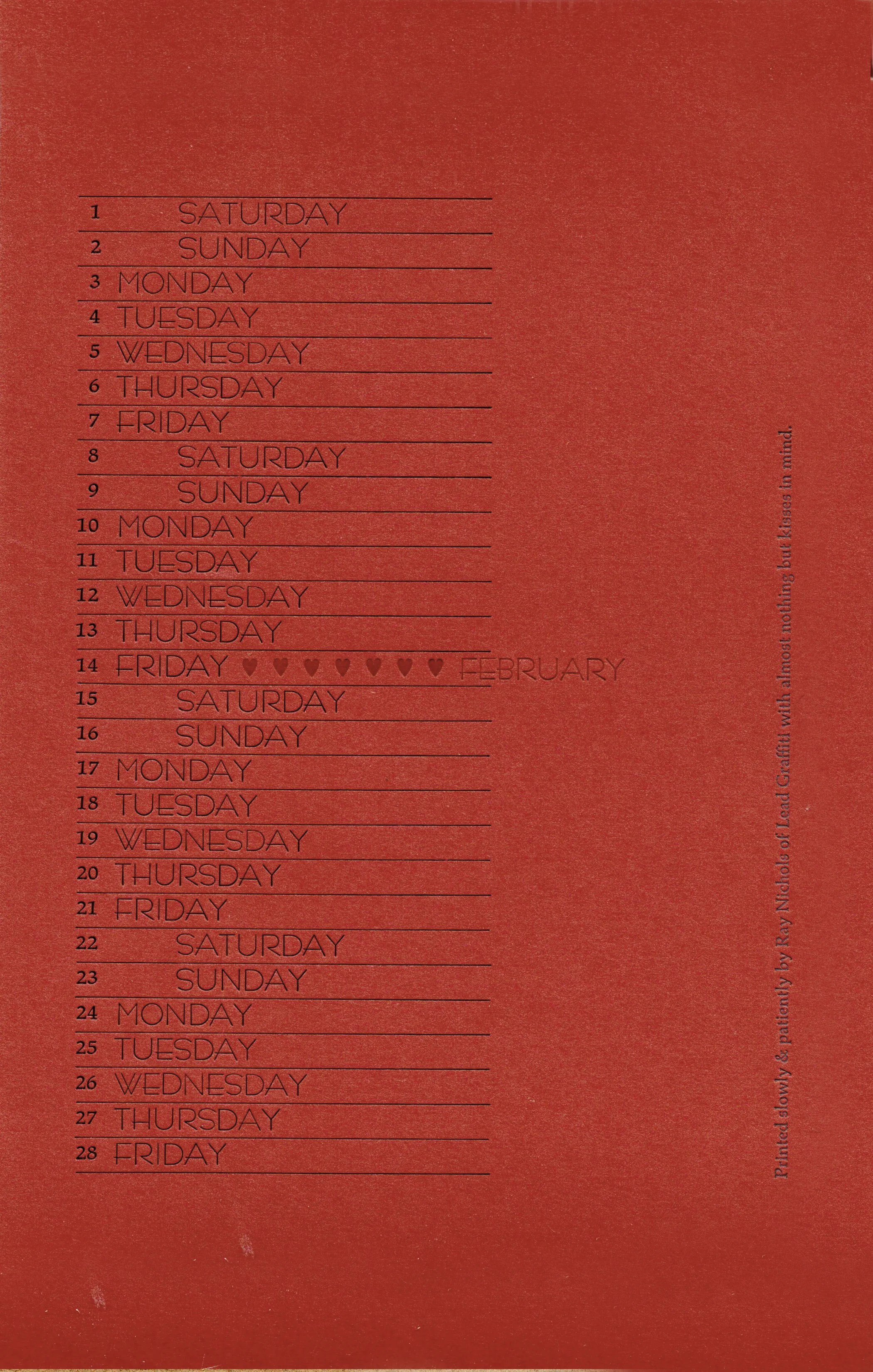 We’ve often collaborated with groups to produce calendars. We often use the opportunity to experiment with a printing technique we’ve had banging around in our heads. We also often challenge the readability of the calendar page as a calendar, much to the chagrin of some of the other printers.